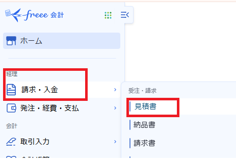 free会計にログイン後ー請求書・入金ー見積書をクリックします。