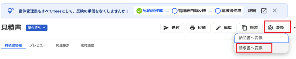 freee会計で作った見積書を請求書に変換する方法をご紹介します。