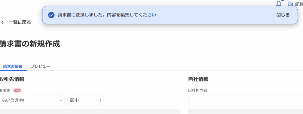 請求書に変換されました内容を編集してください。というメッセージが表示されます。