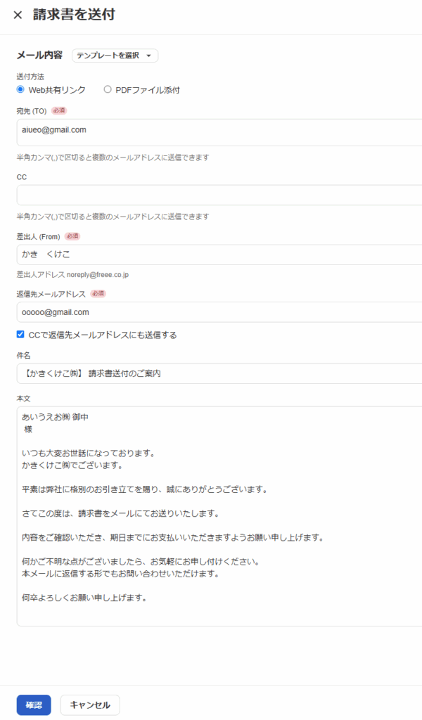 メール送付を選択するとこのようなウィンドウが表示されます。