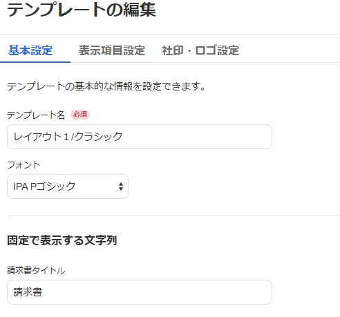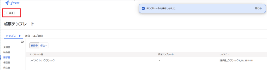 保存ボタンをクリックするとテンプレート一覧の画面に切り替わるので、左上の戻るボタンをクリックすると編集中の請求書に戻れます。