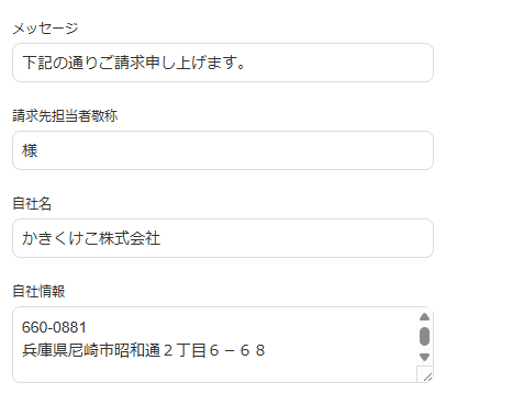 ほかに、自社名や住所を設定しておきましょう。住所も郵便番号から表示しておくほうが親切です。